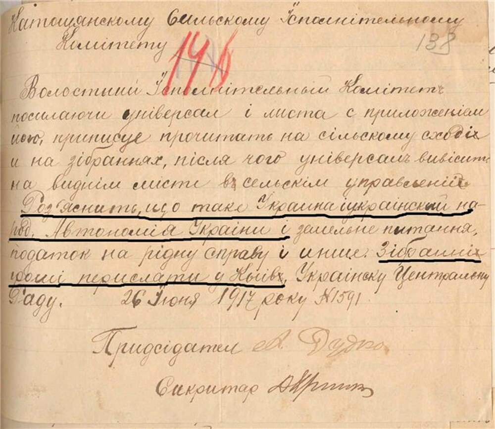 Лист Настасівського волосного виконавчого комітету Катошинському сільському виконавчому комітету про посилку Універсала з розпорядженням прочитати на сільському сході і на зборах, роз'яснити, що є Україна й український